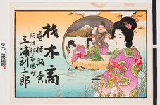 | S0000014229 | 引札絵柄:恵比須大黒(藻を刈る女性→儲かる) 商店場所:阿波郡市場町 商店名称:三浦利三郎 商売内容:材木商 蚕種販売 | 引き札 |