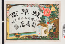 | S0000013770 | 引札絵柄:巨泉画花の絵(ぼたん・桜・菊・水仙) 商店場所:徳島市かごや町中程 商店名称:小間物卸商わたや号 商売内容:東京新形小間物、高等化粧品各種、婦人御婚礼用品、造花用遣草一式 | 引き札 |