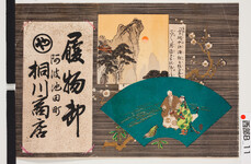 | S0000013855 | 引札絵柄:扇面(高砂)謡曲本(高砂やこの浦船に帆をあげて、、、) 商店場所:阿波池田町 商店名称:桐川商店 商売内容:履物卸 | 引き札 |
