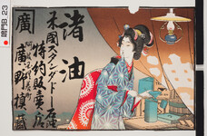 | S0000013936 | 引札絵柄:油を売る女 商店場所:阿波国撫養町 商店名称:廣野槙蔵 商売内容:諸油 米国スタンダドー石油特約販売店 | 引き札 |