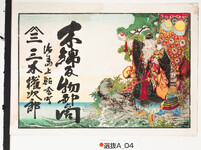 | S0000014028 | 引札絵柄:武内宿祢、応神天皇 商店場所:徳島上鮎喰町 商店名称:三木権次郎 商売内容:木綿反物卸商 | 引き札 |