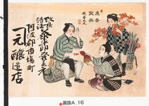 | S0000014032 | 引札絵柄:模範的人物三人の勢揃い(二宮金次郎・養老の滝の源丞内・塩原多助)富岡鉄斎の書あり 商店場所:阿波郡市場町 商店名称:屋号(かねげん)醸造店か 商売内容:改良清酒 泰平印発売元 | 引き札 |
