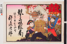 | S0000014065 | 引札絵柄:万歳の字を持つ子ども兵士 商店場所:徳島市かごや町 商店名称:郡直次郎 商売内容:琴三味線商 | 引き札 |