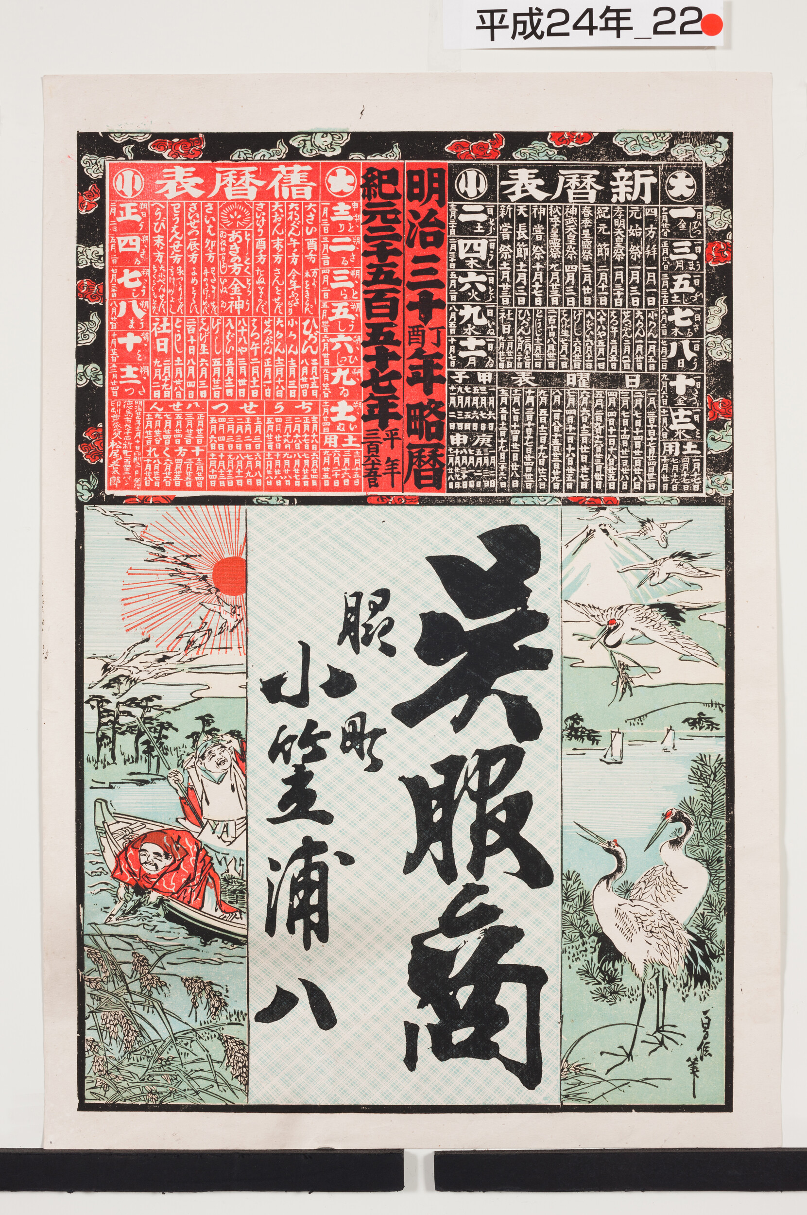 引札暦:上方(明治30年略歴)左下(恵比寿)右下(鶴の図) 商店場所:脇町 商店名称:小笠浦八 商売内容:呉服商
