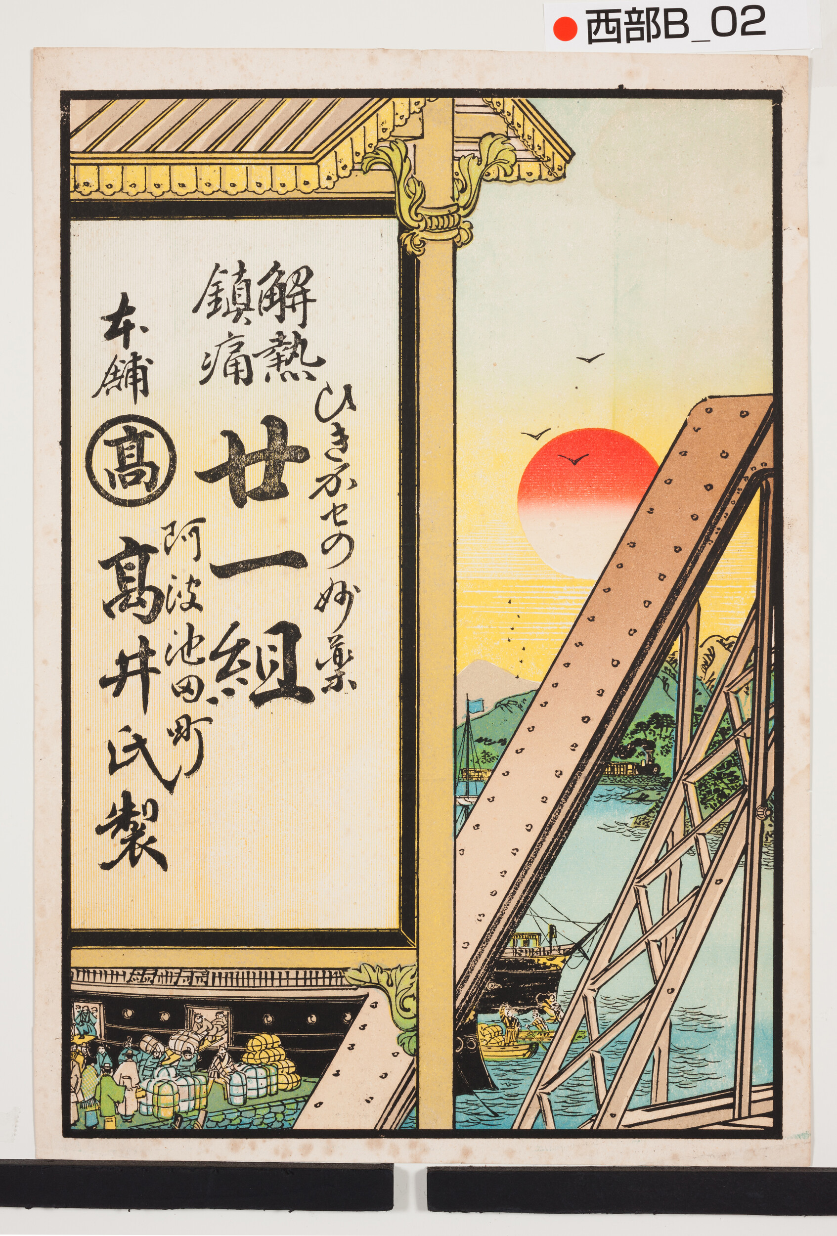 引札絵柄:鉄橋・港の荷積 商店場所:阿波池田町 商店名称:高井氏製 商売内容:薬局(解熱鎮痛・ひき風邪の妙薬21組)
