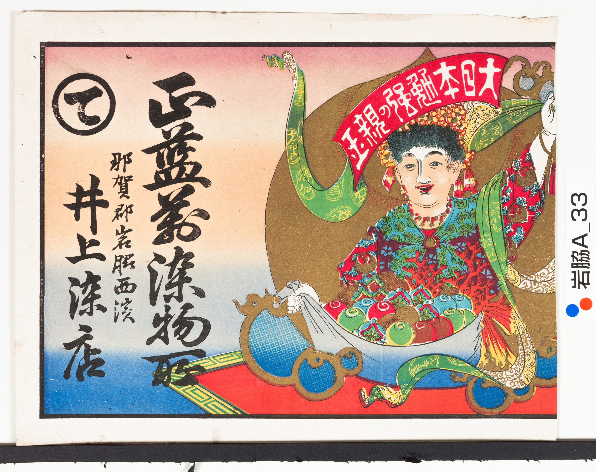 引札絵柄:大日本勉強の親■ マジシャンか 商店場所:阿波国那賀郡岩脇西浜 商店名称:井上染店 商売内容:正藍萬染物所