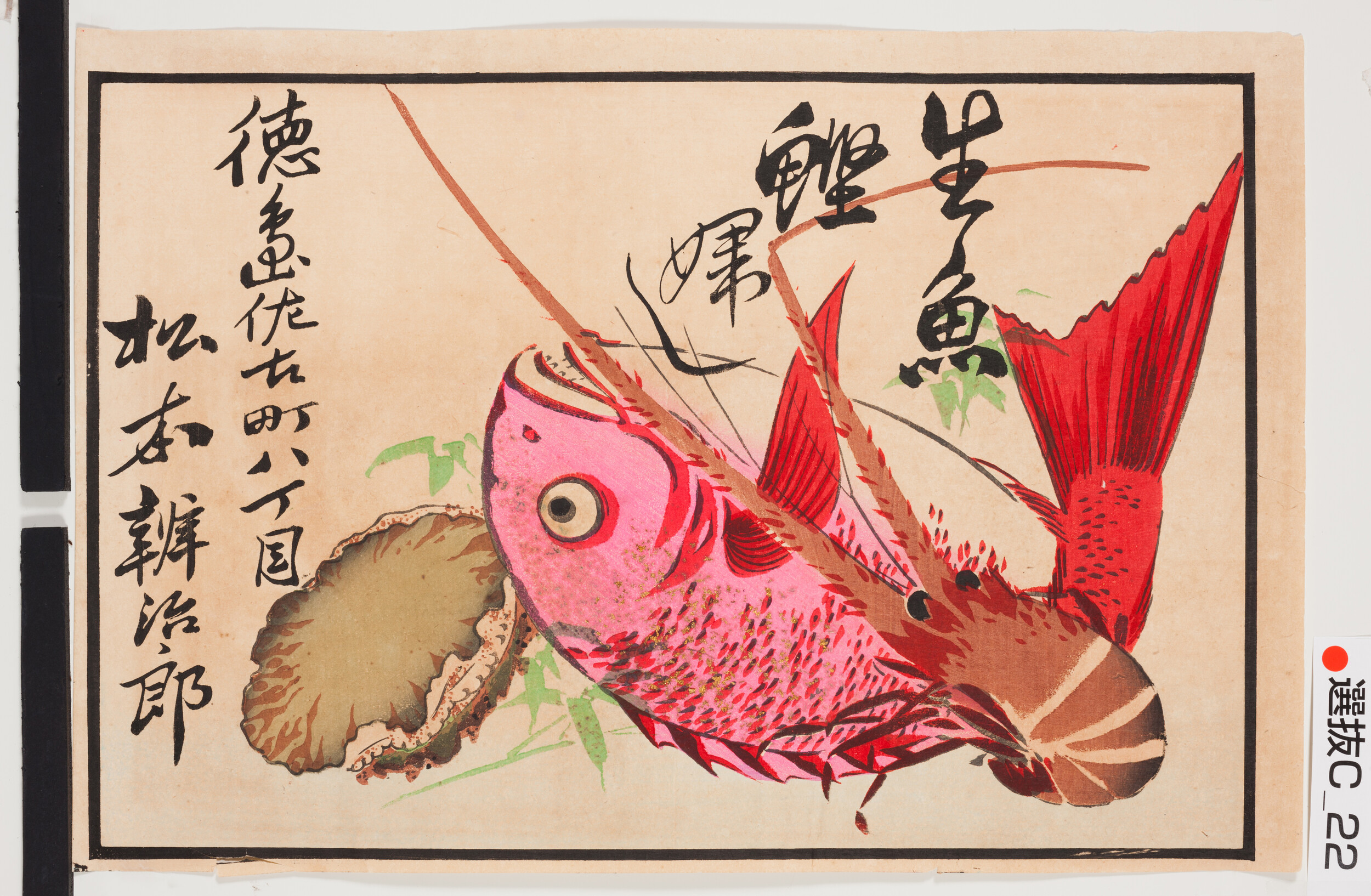 引札絵柄:鯛・伊勢海老・鮑 商店場所:徳島市佐古町8丁目 商店名称:松本弁治郎 商売内容:生魚・鰹節