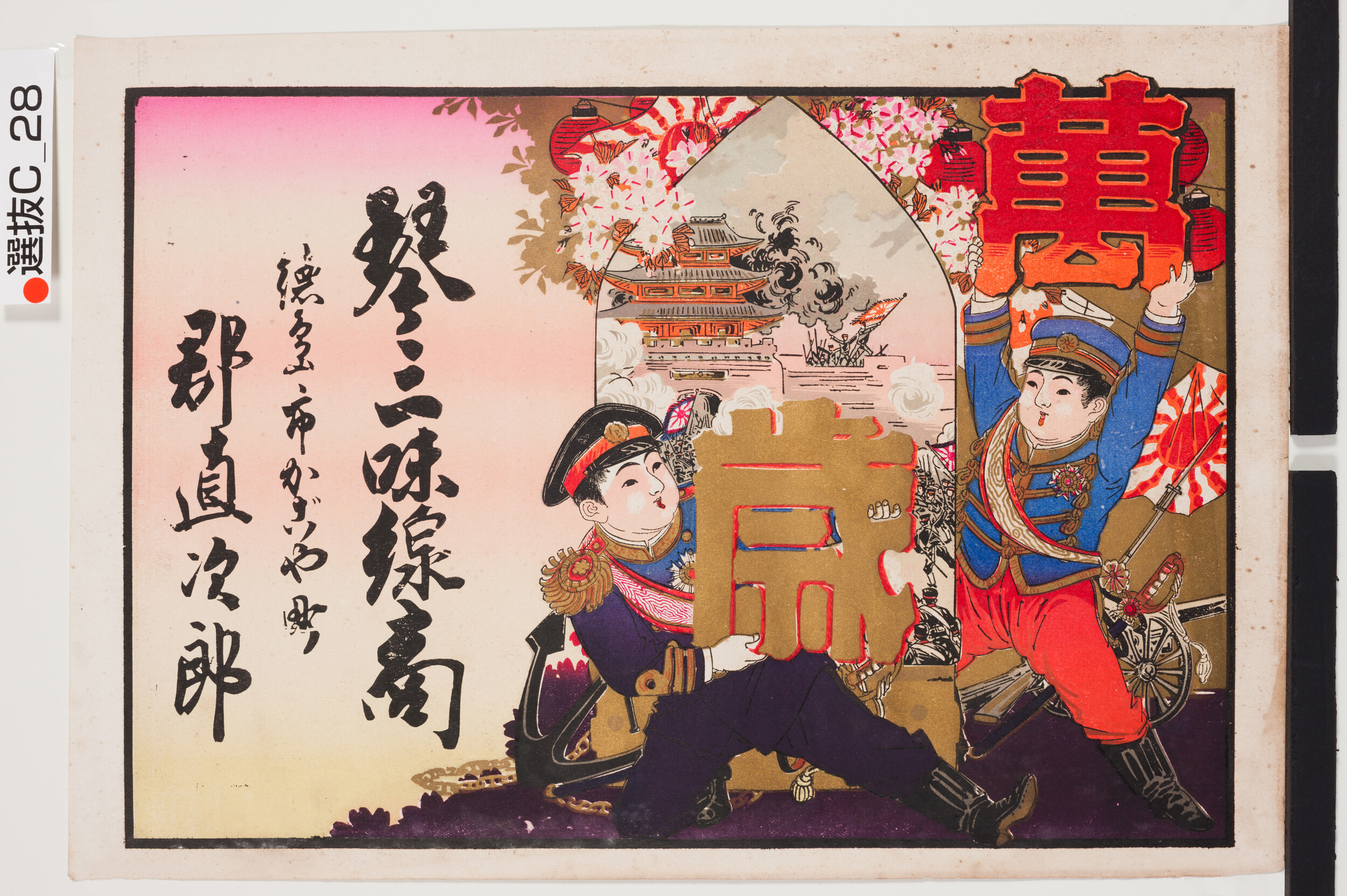 引札絵柄:万歳の字を持つ子ども兵士 商店場所:徳島市かごや町 商店名称:郡直次郎 商売内容:琴三味線商