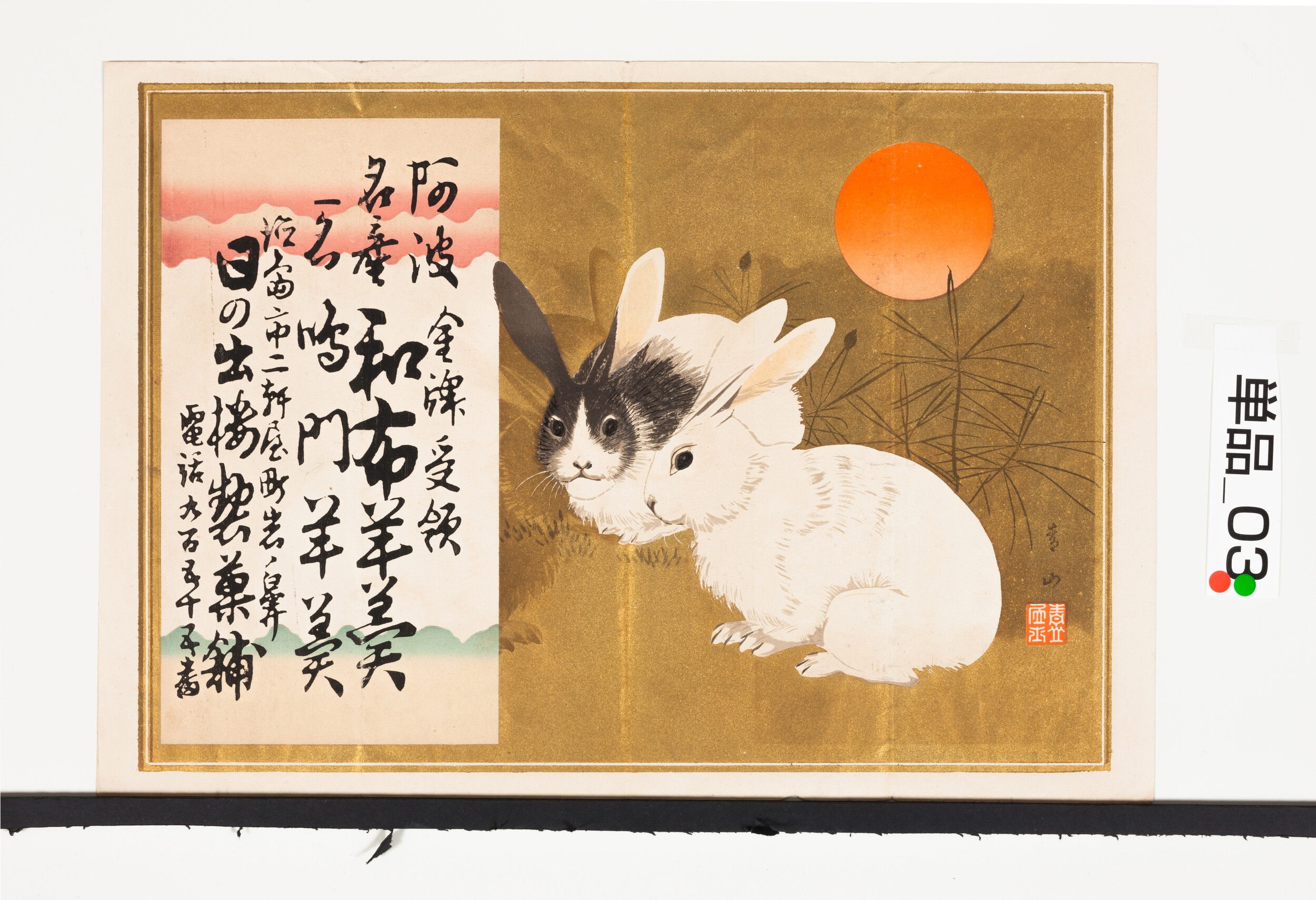 引札絵柄:2疋の兎 商店場所:徳島市二軒屋町岩ノ鼻 商店名称:日の出楼製菓舗 商売内容:阿波名産 和布羊羹 鳴門羊羹